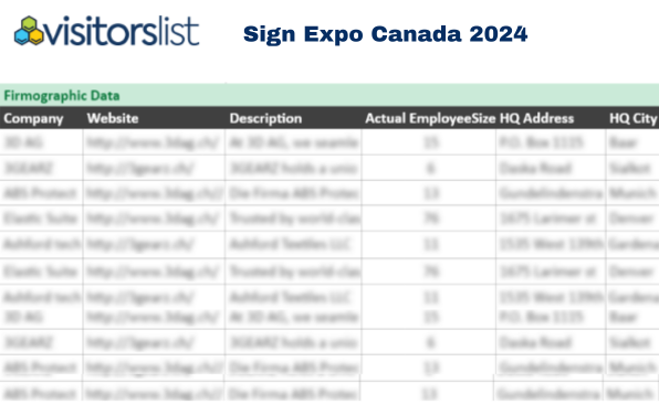 Join us at Sign Expo Canada 2024, the premier signage and graphics industry event where innovation meets opportunity. With thousands of professionals gathering to explore the latest trends, technologies, and solutions, this is your chance to network with industry leaders, decision-makers, and key players. Secure access to our exclusive Sign Expo Canada 2024 exhibitors and attendees database to enhance your marketing efforts, generate high-quality leads, and expand your industry connections. Don’t miss out on this key event in the signage and graphics sector!